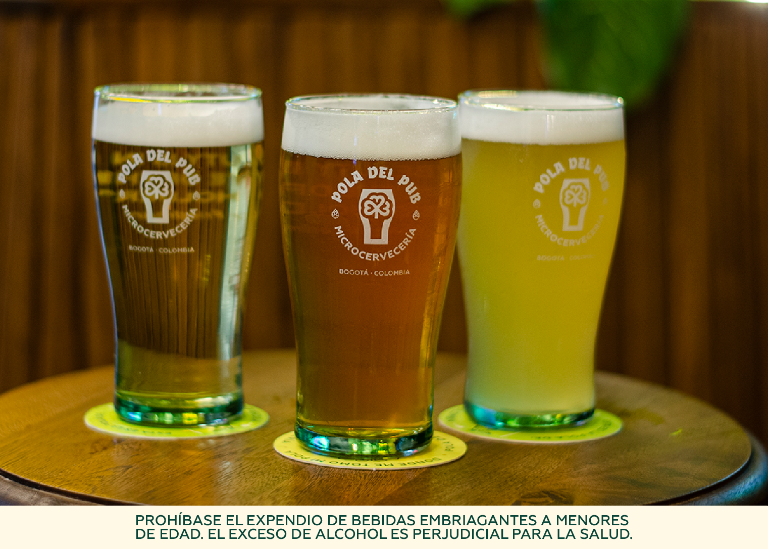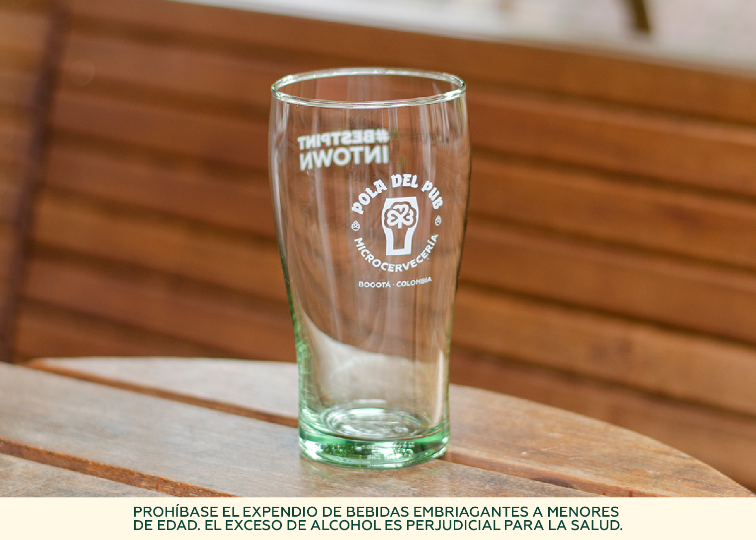 Pinta de vidrio marcada con el branding Pola del Pub para servir cerveza.